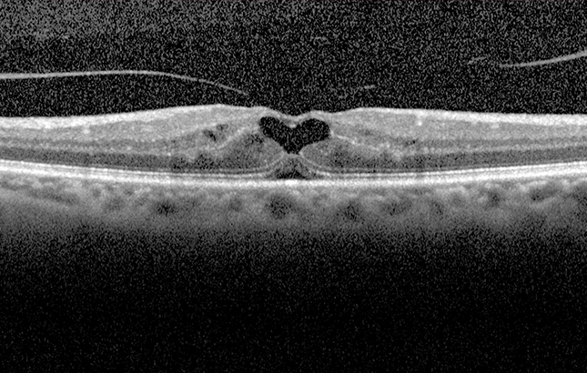 É através da documentação sistemática, mesmo em doentes assintomáticos, que passámos a poder antever desequilíbrios entre as estruturas, e sempre que possível, tentar restabelecê-los. Esta doente foi submetida a vitrectomia, onde houve libertação instrumental do vítreo e aderência vitreorretiniana, de modo a que as camadas da retina se pudessem voltar a unir, renovadas por uma nova relação, desta vez, com uma solução artificial aquosa. A aderência patológica entre o vítreo e a retina ficou resolvida, sem qualquer repercussão nociva na visão.